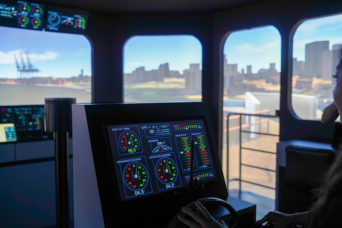 O Digital Ocean Lab processa em tempo real dados de milhares de sensores instalados no mar. A unidade conta com um simulador de manobras de atracação de alta fidelidade, capaz de reproduzir as condições de navegação de todos os portos do país (imagem: Daniel Antônio/Agência FAPESP)